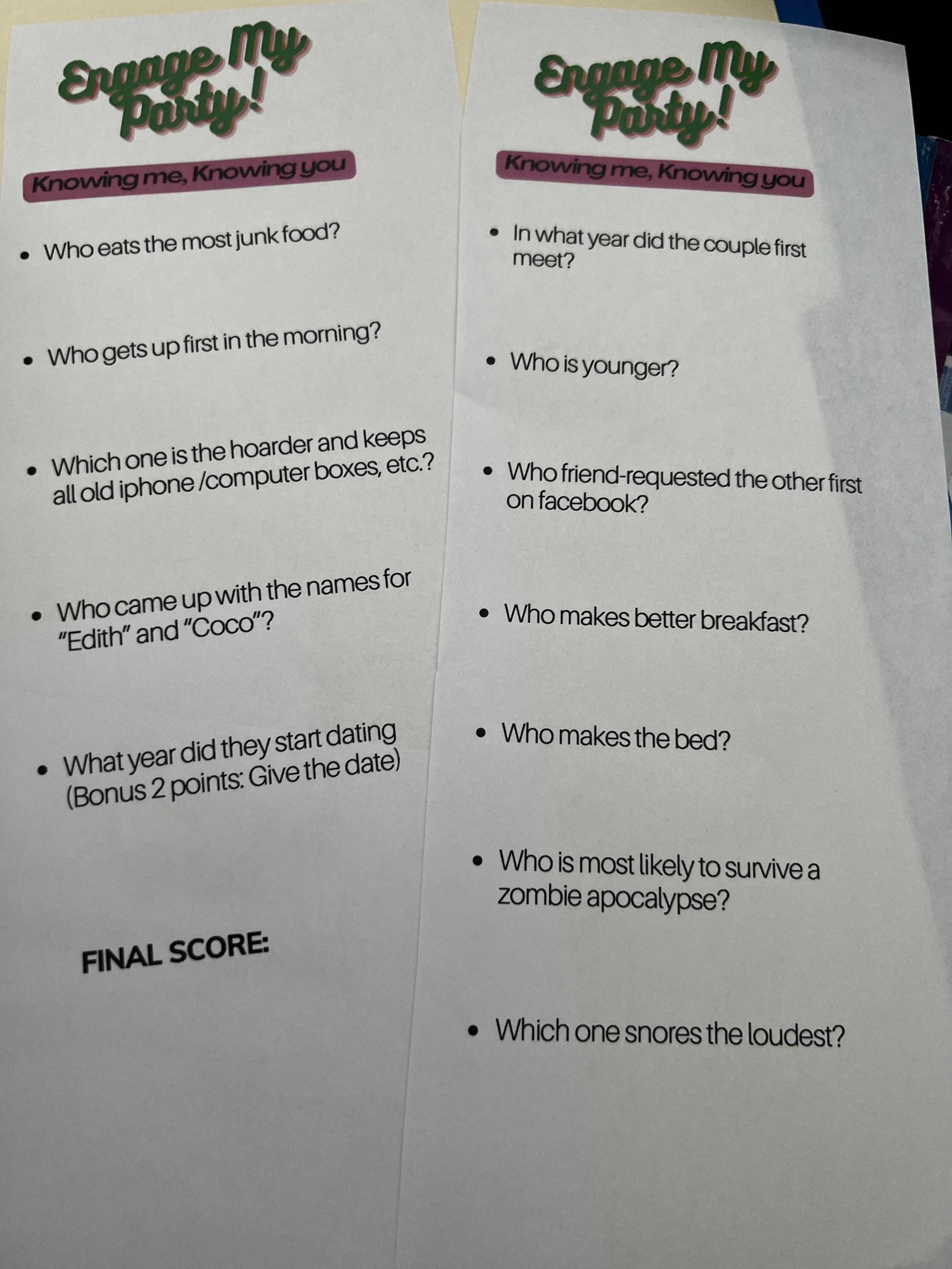 After the meal, Beverly and Maria hosted a pair of games that provided the guests with a chance to compete and prove who knows the couple best. Winners were given chocolaty treats from Eataly.